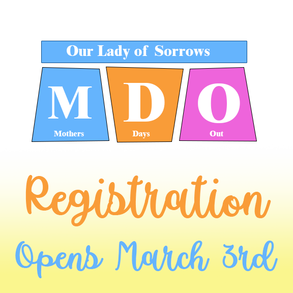 Our Lady of Sorrows Mother’s Day Out Program cares for children from 8 weeks through 4 years old. The goal of our program is to provide for the mental, social, physical, emotional and spiritual development of every child enrolled. Our program gives children loving care and guidance that little ones need during these very important formative years.