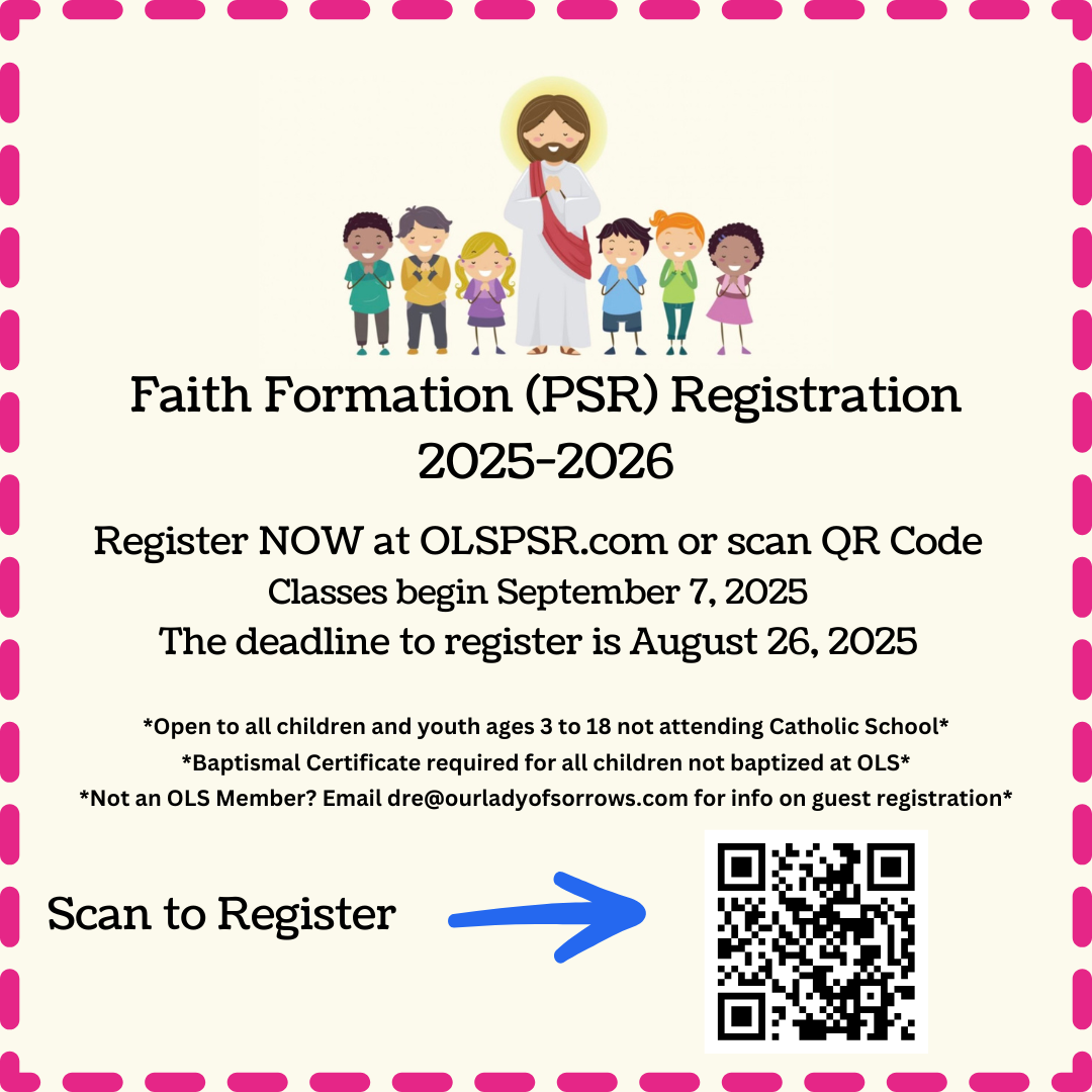 Our Lady of Sorrows Parish School of Religion (PSR) has classes in faith formation/religion for children and youth ages 3 years to 18 years old during the school year. All non-parochial school children should attend these classes. Preparation for First Communion and Confirmation for those not attending Catholic school is through our Faith Formation classes. Classes meet on Sundays from 10:00-11:15 a.m.